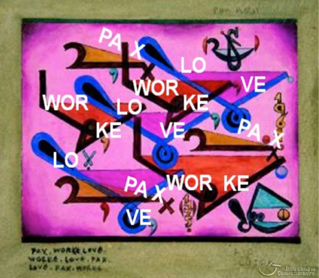 The contrast with Xul is sharp when compared, for instance, with Pax, Worke, Love (1961), where the fusion of words, geometric forms, and alchemical signs opens up interpretive paths rather than closing them. Where Xul’s symbols multiply meaning, Leber’s shut it down. Pax, Worke, Love suggests that peace, work, and love are coordinates within a spiritual experience that resists fixed interpretation. Nuestros hijos, by contrast, seems engineered for immediate impact and broad approval: its spirituality is aesthetic, not epistemic.