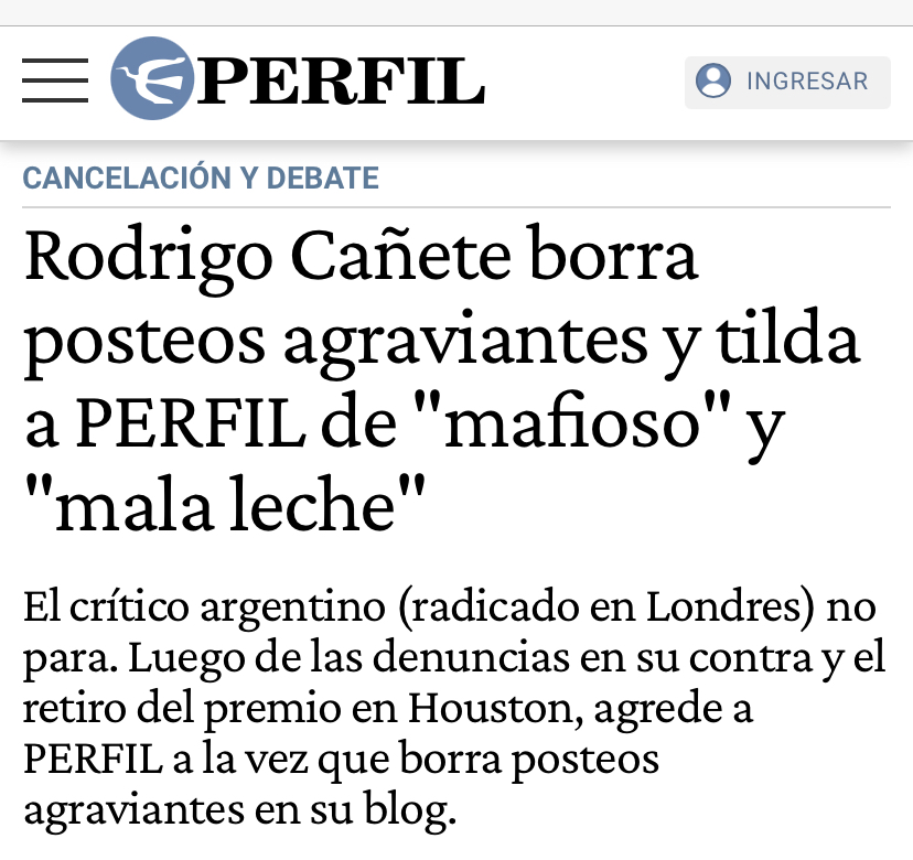 8. Aparece, o la violencia o la negación. Esa es nuestra cultura y eso representa Gigena. El modo que mostró su envidia. Yo lo vivi bastante traumáticamente porque me llamaba para chuparme el culo una vez por semana. Que ademas es algo que me incomoda porque no hago nada que sea para chupar culos. Pero para matarme, sabes lo que le falta! Hace un par de dias apareció para pedir perdon a su manera…con una amenaza solapada. Con esa gente ni se habla. Es la gente que señalaba amigos para que desaparecieran., Tal vez lo hizo. No me extrañaria. Alejandra Uslenghi, Profesora en Northwestern lo definió en el momento en el que se comportó asi durante la cancelacion como ‘oscuridad pura’. Algo muy interesante es que La Nacion, Pagina 12 y Perfil contraten a un muerto para hablar de algo tan vital como la cultura.