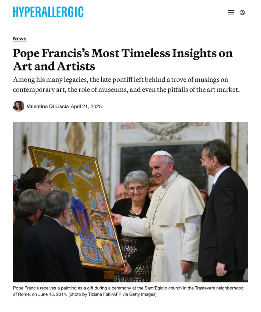 Valentina De Liscia de Hyperallergic reduce ese episodio crucial a una nota al pie a la que califica, en un supuesto homenaje al difunto Papa como ‘infame’ censura para rápidamente pasar al homenaje porque, según ella, Francisco borró su propio vergonzosa relación con el arte para abrazar una estética más digerible. Esto debe ser aclarado porque además, me tuvo de protagonista.