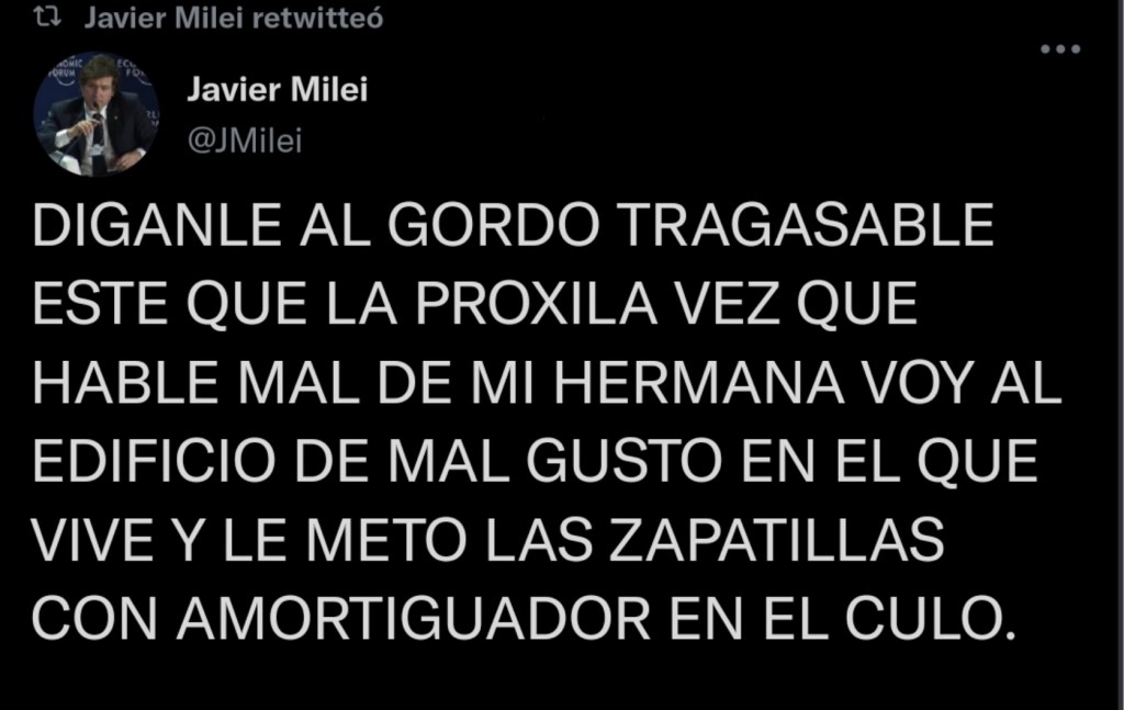 En la cultura contemporánea —y en figuras como el Presidente Argentino Javier Milei en particular— asistimos a una perversión de esta lógica: la pornografía de la muerte. Hay un tweet cuya imagen ha sido sacada de circulación pero que demostraba que, al menos, en su caso, la muerte no enseña. La muerte se representa, se recicla, se consume como imágen: como meme. Pero lo que resulta particularmente interesante es que se consume como meme sexualizado. El cuerpo ajeno ya no es límite ni testimonio: es superficie disponible para la humillación, para el goce trivial, para la mueca de una victoria que jamás se libra en combate real. Es casi como un video juego pero en el país de las torturas y las desapariciones.