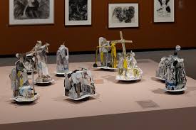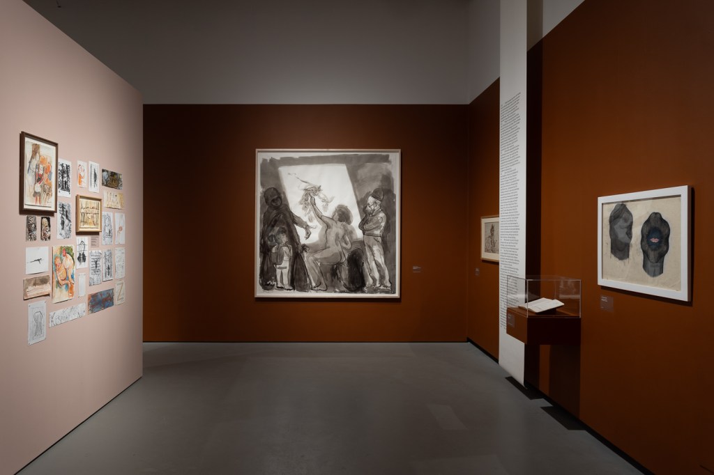 No soy adepto de los enfoques psicoanalíticos en el arte, pero Jacques Lacan aparece casi como una referencia obligada tras esa afirmación. Cuando ella dice que los dibujos reaccionan a la experiencia de ser un cuerpo en el mundo, señala un regreso al caos pre-especular del infante—una confrontación con la corporalidad no como posesión del yo, sino como vulnerabilidad, división, permeabilidad. De ahí: “Un cuerpo que sufre emociones ambivalentes, que puede herir y ser herido, combinado con otros en juegos, en deseo…”. Según Lacan, el deseo nunca se dirige simplemente al objeto—está mediado por el deseo del Otro. Las emociones son ambivalentes porque el deseo está estructurado por la falta, no por la necesidad. Juegos y deseo no son inocentes: son campos donde el sujeto se constituye y se aliena a través del lenguaje, la mirada y el poder. El cuerpo no es autónomo, sino relacional—su sufrimiento y su placer provienen del entrelazamiento con el deseo del Otro. La jouissance (disfrute/dolor excesivo) evocada por “herir y ser herido” toca lo Real—esa parte de la experiencia que escapa a la simbolización, pero que insiste a través del trauma, la ruptura, la repetición. Esto se ilustra en la muestra con las representaciones de traumas individuales de Paula Rego y Kara Walker. Bourgeois, en cambio, transmite que el trauma solo puede abordarse a través del desplazamiento, la alegoría, la opacidad. Los ensayos de Jackowski sobre la obliteración obscena del cuerpo no son trauma sino catarsis. Hay un riesgo constante en la muestra de convertir los relatos traumáticos en identidades, lo cual abre la puerta a la traumatología estilo NHS.