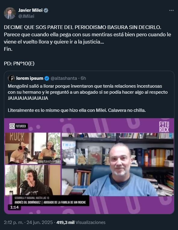 But that same Mengolini recently became the target of a libertarian swarm attack—a performance of revenge, if you will. It came after she accused Javier Milei of having “sexual feelings” for his sister. The response from Milei’s digital army wasn’t to deny it; it was to use her as a mirror, a screen of projection.