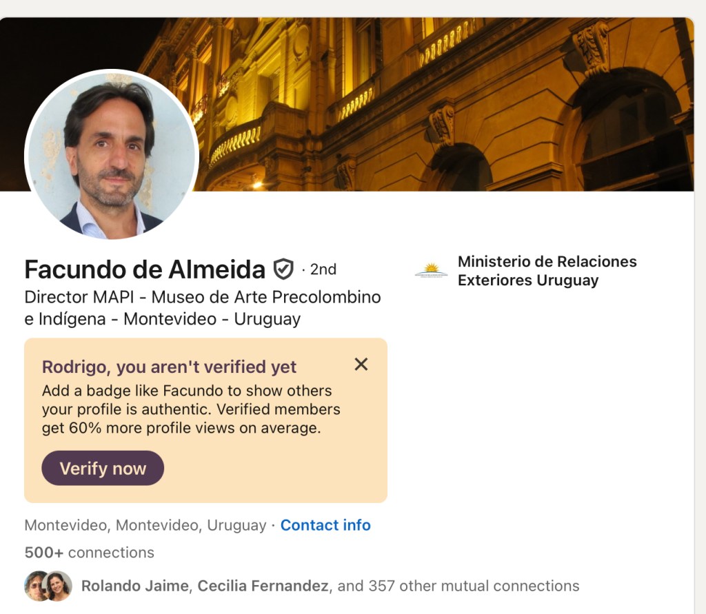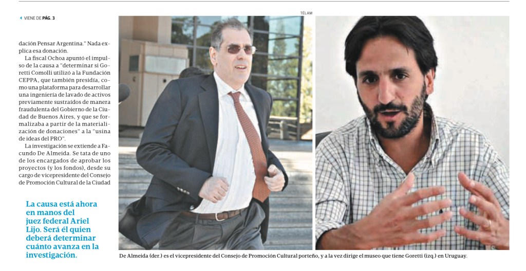 Cuando se corre el telón ornamental del “patrimonio” y se deja de mirar la foto con placa de bronce para seguir los papeles, aparece una red nítida. El hilo conductor es Facundo De Almeida: secretario privado de Teresa Anchorena durante la gestión de De la Rúa (como Subsecretaria y Secretaria de Cultura), de Rubén Stella (conmigo como jefe directo) y luego con Macri (como Presidenta de la Comisión Nacional de Monumentos); más tarde, funcionario clave del Consejo de Promoción Cultural de la Ciudad de Buenos Aires —la autoridad de aplicación de la Ley de Mecenazgo— y, al mismo tiempo, gestor/directivo del Museo de Arte Precolombino e Indígena de Montevideo (MAPI), una institución cuyo núcleo inicial se armó en torno a una cesión de piezas del coleccionista Matteo Goretti.