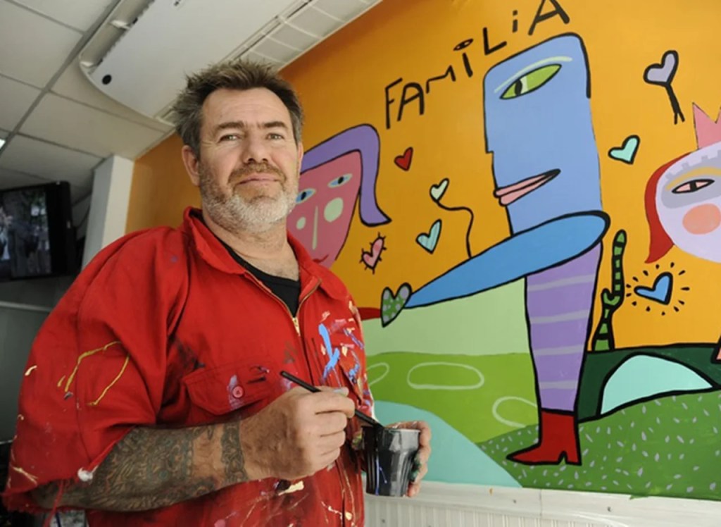 Queda, claro, el texto de la obra. Y conviene tomárselo en serio, porque ahí se ve la ingeniería. Cromatismo: paletas saturadas, sin reñir con el “alegre elegante” que soporta interiorismo de revista. Dibujo: línea segura, ni sucia ni “virtuosa”, sino táctil. Composición: centralidad de figura, relación figura/fondo sin profundidad, campo de color plano que admite variaciones. Escritura: palabras breves (nombres propios, sustantivos, frases “húmedas”), que dan un plus emocional sin densidad semántica. Superficie: lacado como promesa de “producto bien terminado”, brillo que multiplica luz y convierte el cuadro en un espejo social: devuelve a quien mira la emoción amable de su propia compra. Iconicidad: niño, animal, mujer de ojos grandes, el “muñequito” que retiene algo de garabato y, por eso, “autenticidad”; pero sin riesgo de ilegibilidad. “Basquiat” aparece como cita sin compromiso: la energía del trazo y del grafismo callejero, la coronita. Todo es vacunado contra el conflicto, el SIDA, la devaluación pero lo único que hace es enfermar al arte, trabajar en un gobierno que no provee medicamentos a los seropositivos y negar el contexto social.