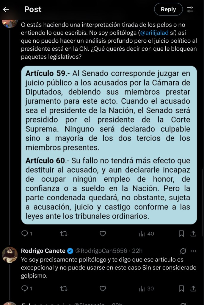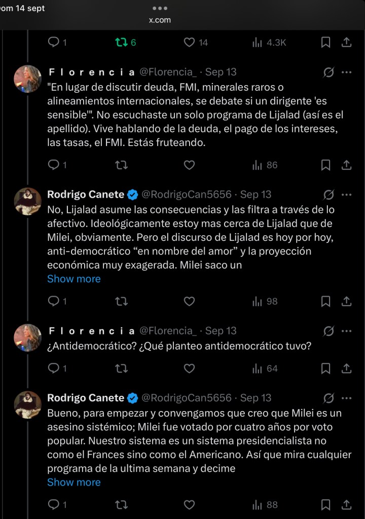 Hace dos días escribí que el discurso de algunos periodistas cercanos al progresismo argentino, al estilo de Ari Lijalad, Rosemblat o Roberto Navarro, había derivado en un gesto antidemocrático y lo que lo hacia peor es que, sintomáticamente, esto era “en nombre del amor”. La reacción no tardó en llegar: me acusaron de exagerar, de malinterpretar, de “frutear”. Sin embargo, el intercambio que mantuve en X con varias voces me confirma que el problema no es semántico: es político. La lógica es siempre la misma. Ante un presidente elegido por el voto popular —en este caso Javier Milei— se naturaliza la idea de que el mandato puede y debe ser interrumpido, no ya por un juicio político en condiciones excepcionales, sino por el deseo de sectores que se creen autorizados a leer la Constitución como una herramienta a mano para cualquier disconformidad coyuntural. Se estetiza la política como si fuera un folletín moral: “si el presidente no garantiza derechos básicos, hay que removerlo”.  Vean este intercambio que tomo como paradigmático por lo que moralista y autoritario: