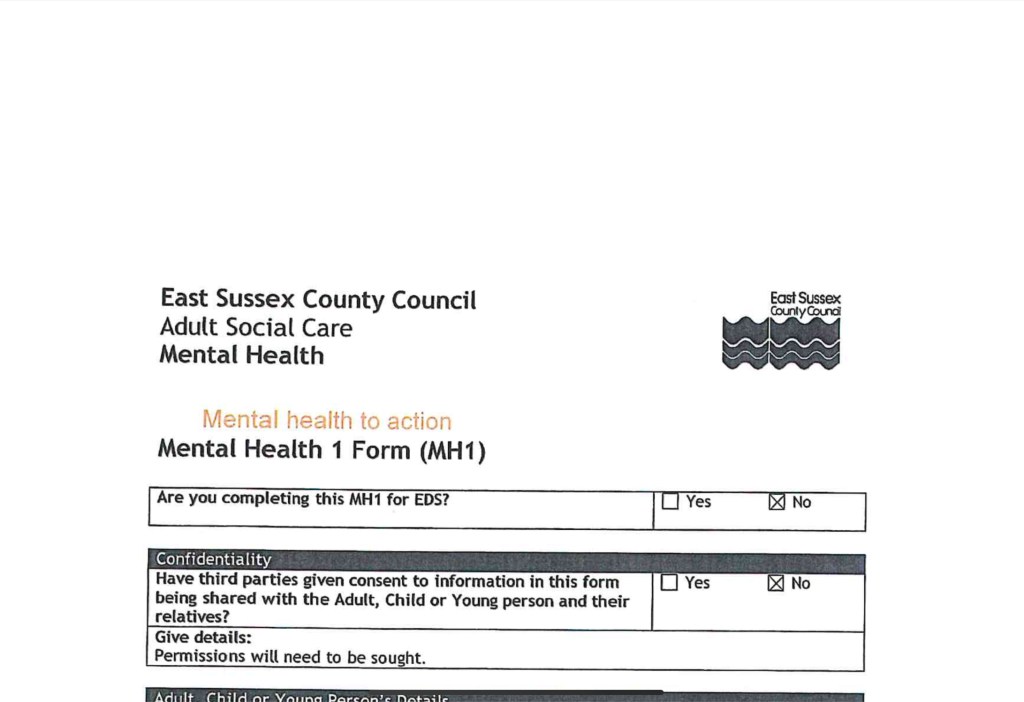 El 2 de enero de 2024, entre las 05:40 y las 10:00 de la mañana, Adult Social Care de East Sussex redactó un formulario MH1 Mental Health sobre mí. Lo hicieron mientras yo estaba detenido en custodia policial, sedado, desorientado, sin abogado y sin poder dar consentimiento. El propio formulario lo reconoce: “Consent to share information: NO”.