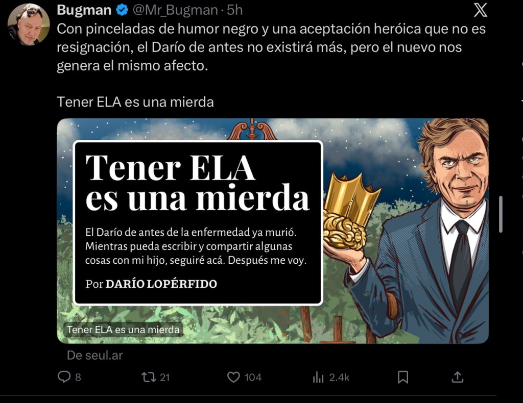 Para Lopérfido, la ELA es exactamente eso: el Venusberg del cuerpo burgués. No la muerte —que él vende como “épica” si tiene glamour—, sino la pérdida del control de la forma. La baba, el temblor, la caída, la voz que se vuelve alcohólica. No teme dejar de vivir; teme dejar de parecer quien fue. Lo que para cualquier paciente es síntoma, para él es ordinariez.