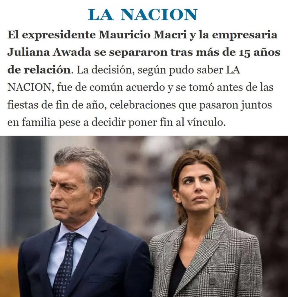 La reciente separación de Mauricio Macri y Juliana Awada –confirmada tras 15 años juntos – estuvo rodeada de especulaciones mediáticas, pero carece de explicaciones públicas concretas. No existe ningún comunicado oficial ni declaración detallada de la expareja sobre los motivos internos de la ruptura. A lo largo de 2024 circularon rumores de crisis matrimonial, alimentados por la ausencia de fotos juntos y viajes por separado . En noviembre de 2024, sin embargo, Awada negó públicamente esos trascendidos, asegurando a la prensa: “Estamos súper bien, mejor que nunca” . Macri también desmintió problemas entonces, incluso compartiendo una foto familiar que calmó las aguas momentáneamente . Recién a fines de 2025, sin más desmentidas, las versiones de distancia cobraron fuerza y desembocaron en el anuncio de la separación, presentado como una decisión de común acuerdo y por el bien de la familia. Obvio…