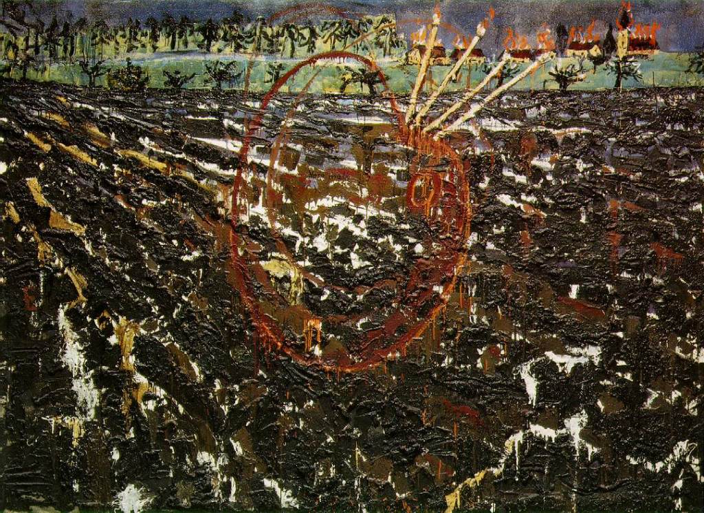 Por eso la comparación con Anselm Kiefer no es inocente. Kiefer entiende que, después de la catástrofe, el paisaje no puede consolar. Sus campos quemados, sus tierras agrietadas, sus superficies pesadas no buscan belleza ni reconciliación. Buscan impedir el olvido. En Kiefer, la tierra no es fondo: es acusación material. Es memoria que pesa.
