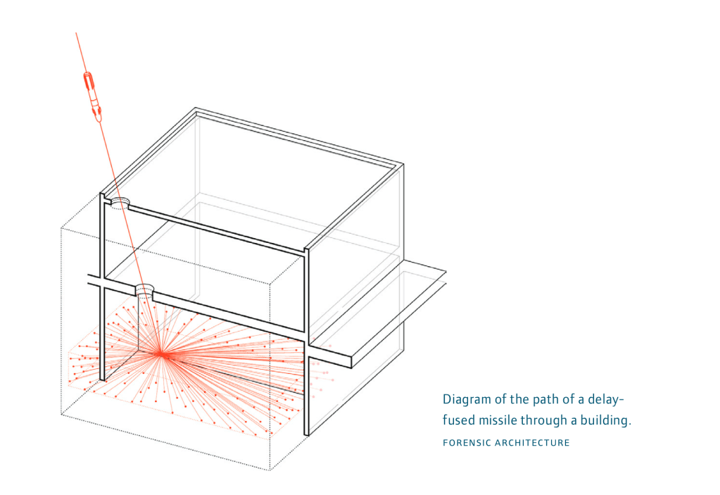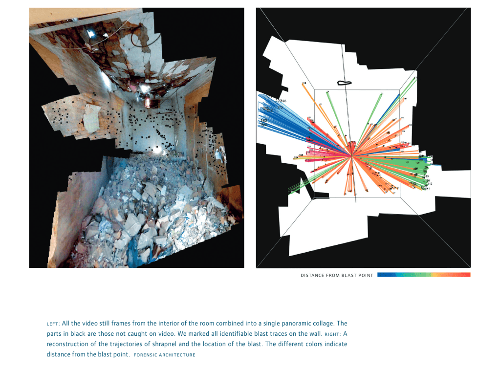 Por eso el trabajo de Weizman y sus seguidores, no consiste en “mostrar” conflictos, sino en reconstruir evidencia allí donde el acceso está restringido, el archivo está dañado y la imagen es insuficiente. Un agujero en un techo, una sombra en un video, la geometría de una explosión, la ausencia de marcas en un muro: todo puede volverse prueba si se lo lee correctamente. La arquitectura deja de ser fondo y pasa a ser forma y figura.